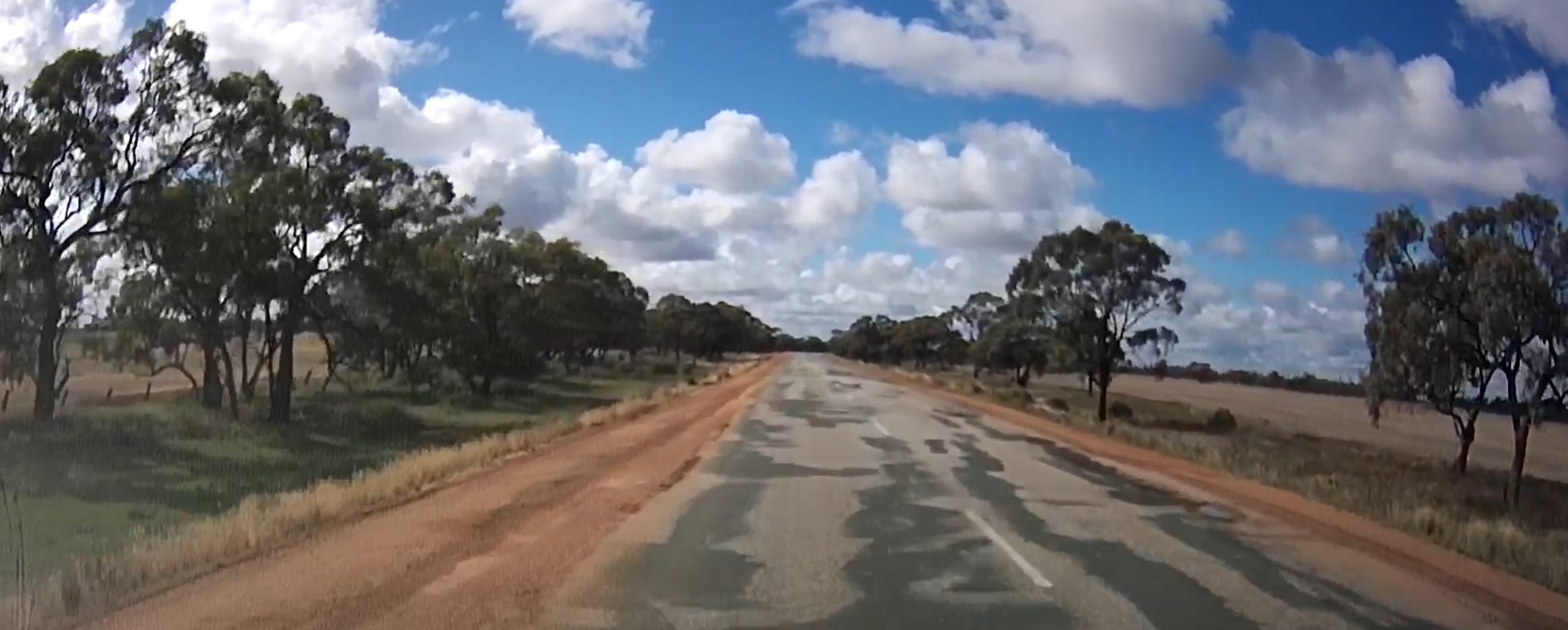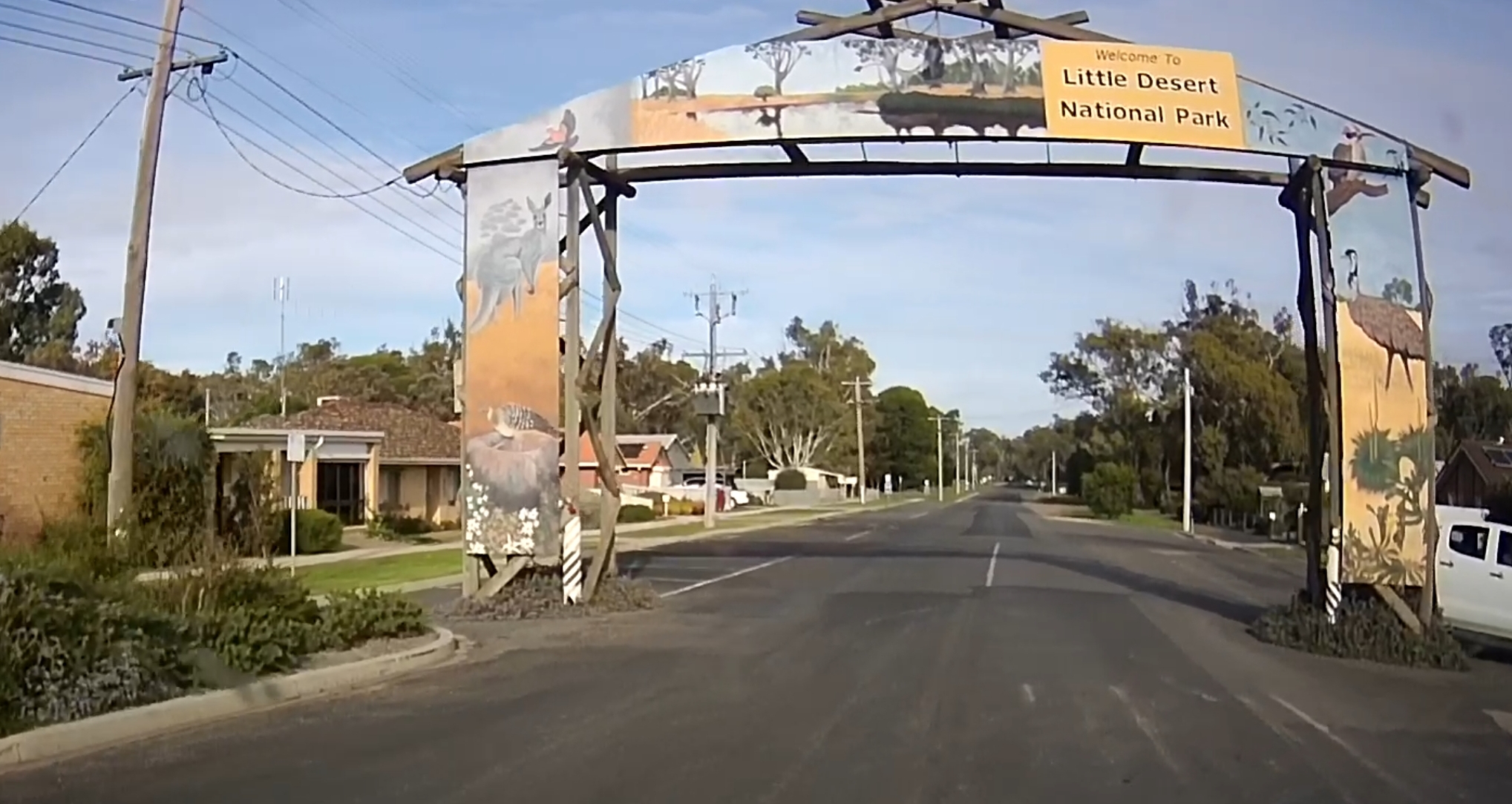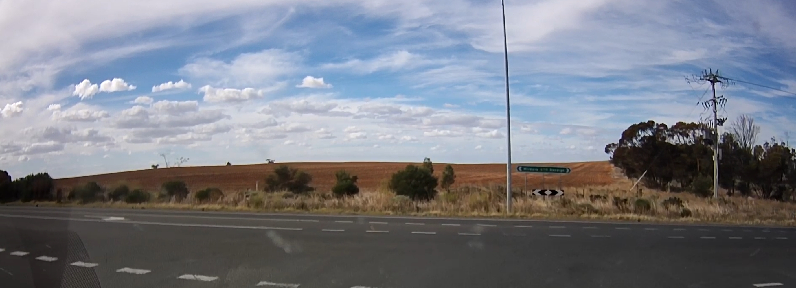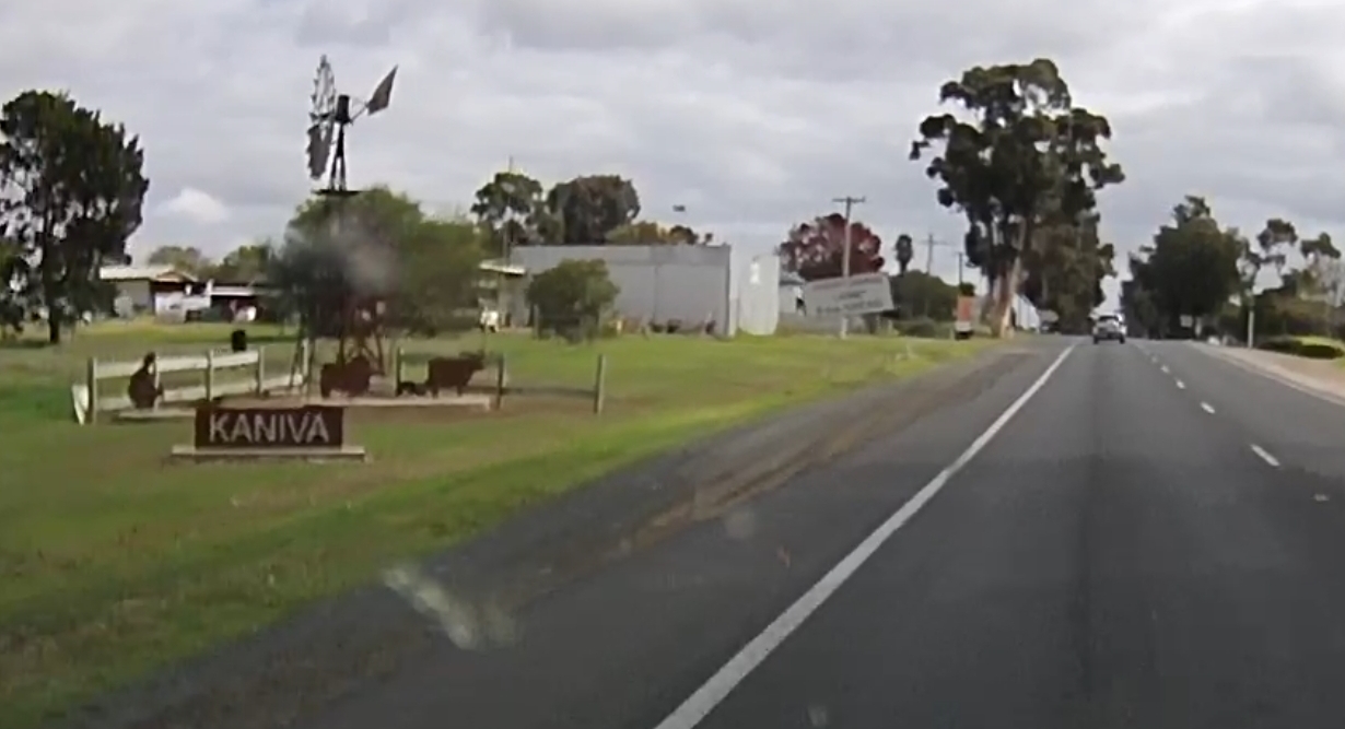 That’s a silo in the distance! There were a few roadworks along the way! A square hole in that cloud. One of many oversize loads/vehicles. Gum trees stretching for miles. An avenue of trees on the way to Edenhope. Metal sculpture on the outskirts of Kaniva. Dachshund Museum in Edenhope. Dimboola – entrance to Little Desert. The road goes on for miles and miles. One of many forks in the road. Hay bales in the paddock next to the road – lots of them! Patchewollock silo in the distance. Welcome to Rainbow! What crop is that? Lake Tyrrell. What crop is this? Back in NSW – more patch than road? Water at the side of the road from recent flooding. More road! Metal emu sculptures … somewhere! Giraffe at entrance to Altina Wildlife – near Narrandera. Fairly large truck! One of the two motorcycle groups we saw.