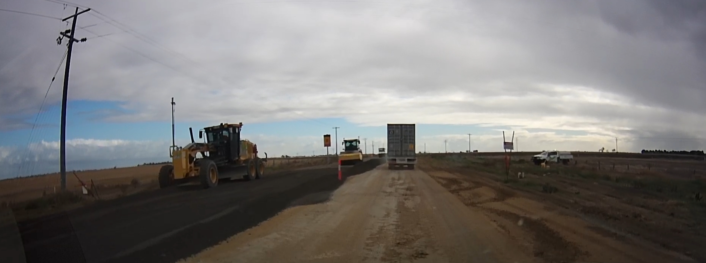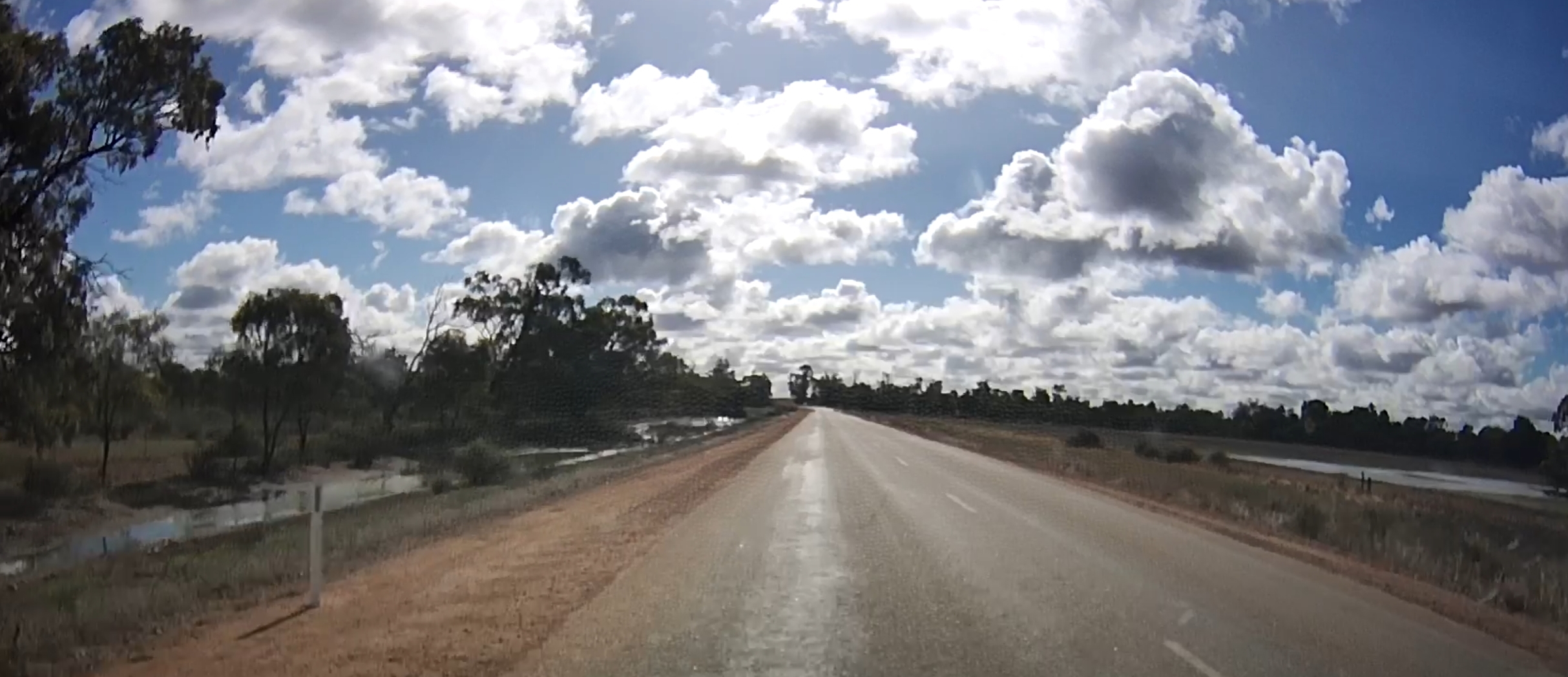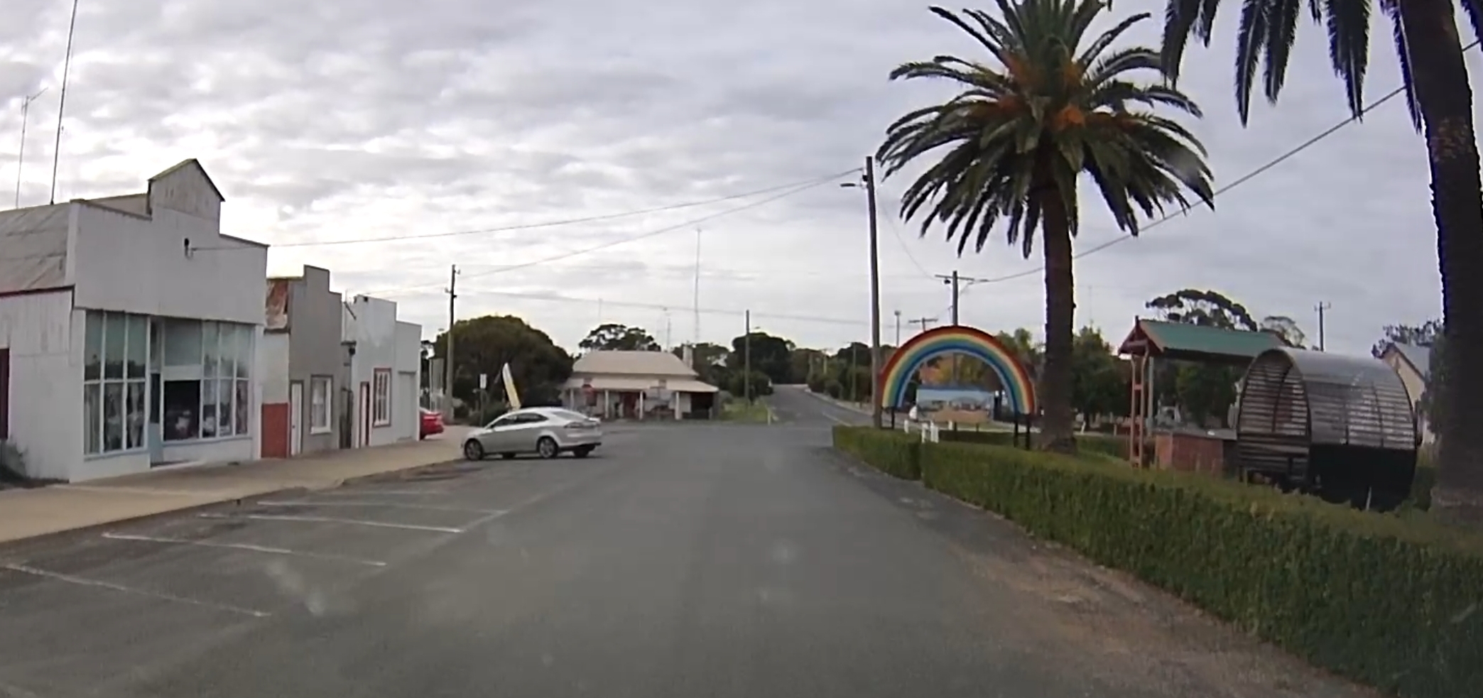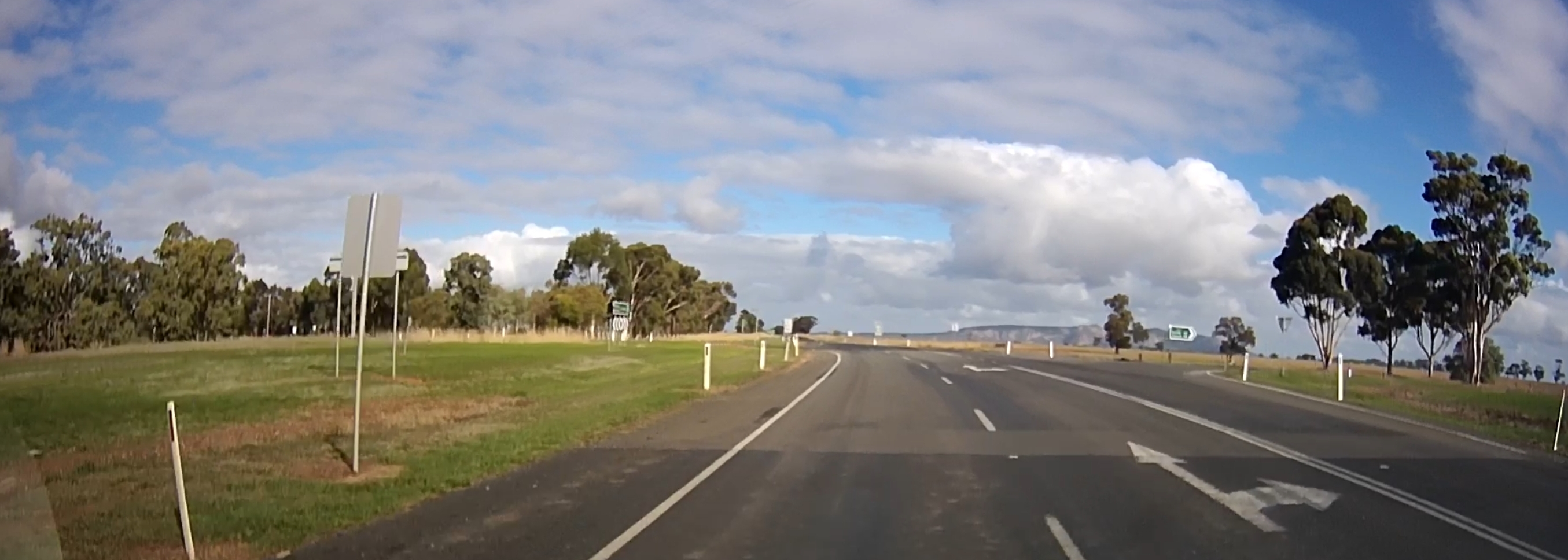 That’s a silo in the distance! There were a few roadworks along the way! A square hole in that cloud. One of many oversize loads/vehicles. Gum trees stretching for miles. An avenue of trees on the way to Edenhope. Metal sculpture on the outskirts of Kaniva. Dachshund Museum in Edenhope. Dimboola – entrance to Little Desert. The road goes on for miles and miles. One of many forks in the road. Hay bales in the paddock next to the road – lots of them! Patchewollock silo in the distance. Welcome to Rainbow! What crop is that? Lake Tyrrell. What crop is this? Back in NSW – more patch than road? Water at the side of the road from recent flooding. More road! Metal emu sculptures … somewhere! Giraffe at entrance to Altina Wildlife – near Narrandera. Fairly large truck! One of the two motorcycle groups we saw.